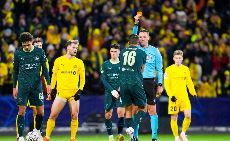 易边再战,第58分钟,海于格轰出世界波,为博德闪耀锁定胜局。第60分钟,谢尔基禁区外贴地斩扳回一球。第62分钟,罗德里1分钟内连吃两张黄牌,裁判将其罚下。